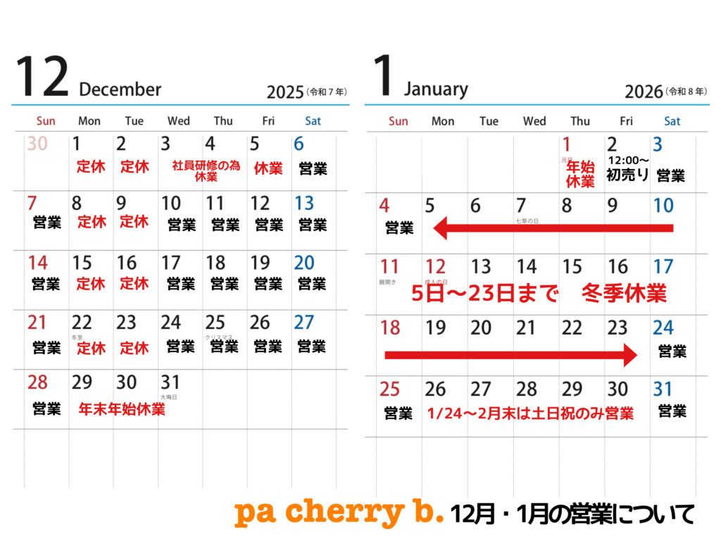 また、1/24〜2月末までの期間は土日祝のみの営業となります。ご来店の際はお気をつけください。